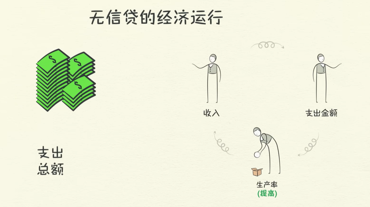 在没有信贷的经济运行中,增加支出的唯一办法是提高生产率进而提高收入,如下图。而在有信贷的经济运行中则还可通过信贷增加支出,使得收入增长速度短期内超过生产率增长速度。