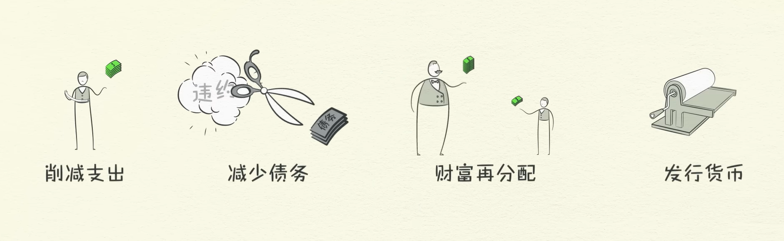 造成去杠杆化的主要因素就是债务,应对杠杆化有如下四种方法: