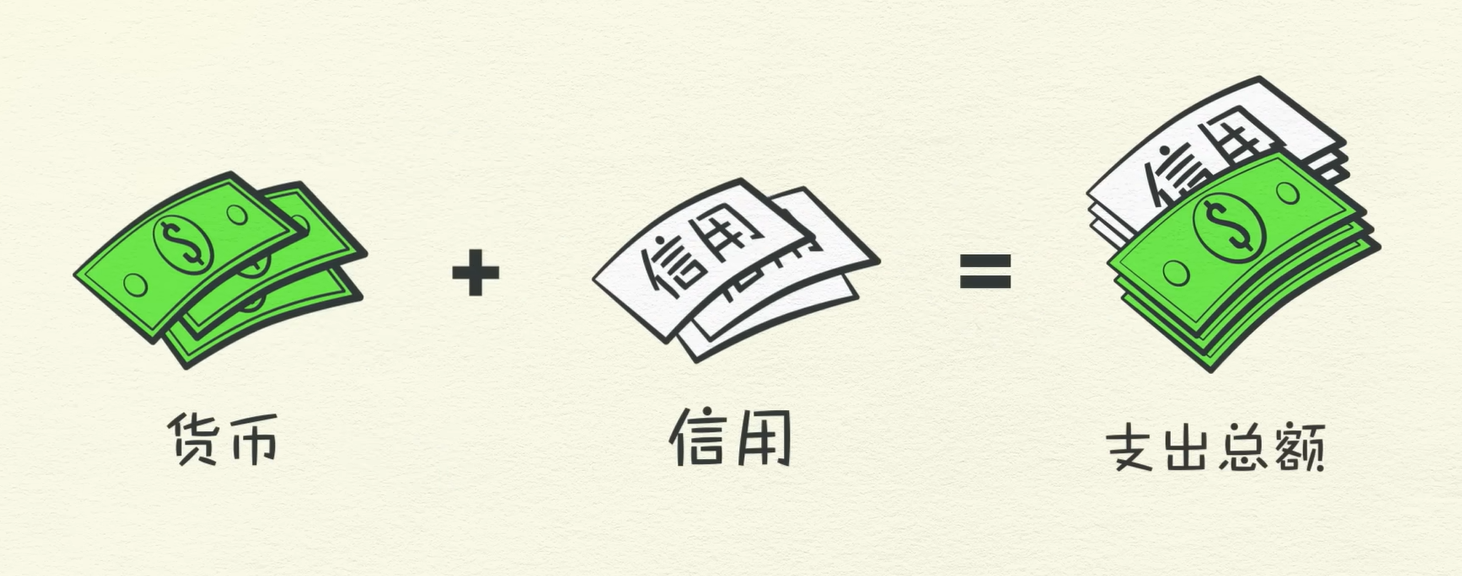 经济的本质就是无数交易的总和,交易过程中可以使用货币或信用去购买商品、服务、金融资产,为什么需要交易呢?如果不进行交易,每个人都自己种粮、缝衣、盖房,自满自足,那么人类的文明会永远停留在原始状态,然而现实是人类的欲望是无限的,而自己掌握的资源往往是有限的,要用有限的资源撬动无限的资源,必然会产生交易。这里姑且将 货币 + 信用看作支出总额,如下图: