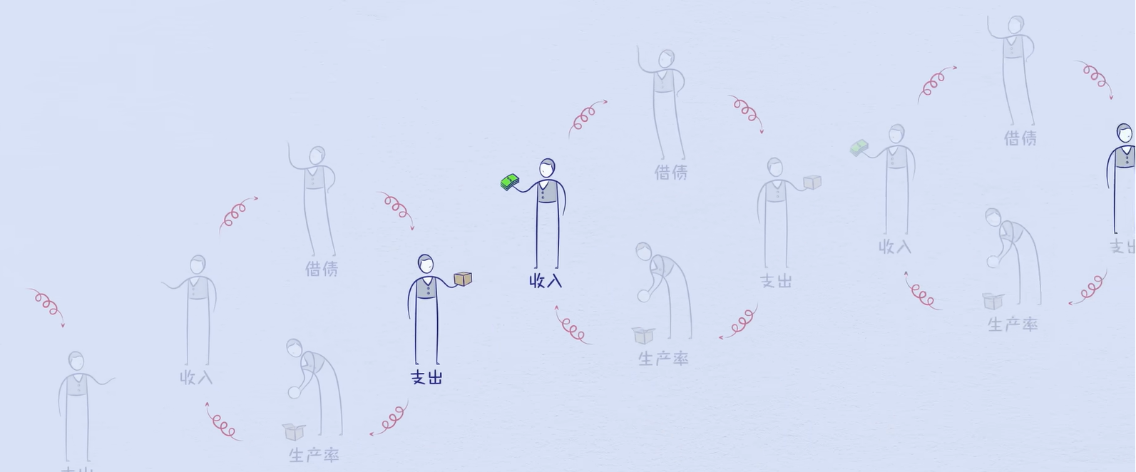 借款人借贷后,其可支出额度便会增加,而其支出相当于另一个人的收入,而另一个人的收入增加,其信用度便提高,借款人就更愿意把钱借给他,那么他将有更多可支出额度,由此循环产生了经济周期,如下图: