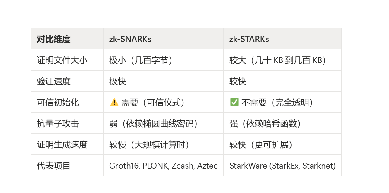 其最大的缺点是证明文件体积更大,往往比 SNARKs 大出几十倍甚至上百倍。这意味着把这个证明发布到链上的 Gas 费会更贵,也更占用网络带宽。此外,STARKs 依赖的密码学假设(主要是哈希函数的抗碰撞性)在数学上更"朴素”,被认为在量子计算时代来临时,具有更强的抗量子攻击能力。