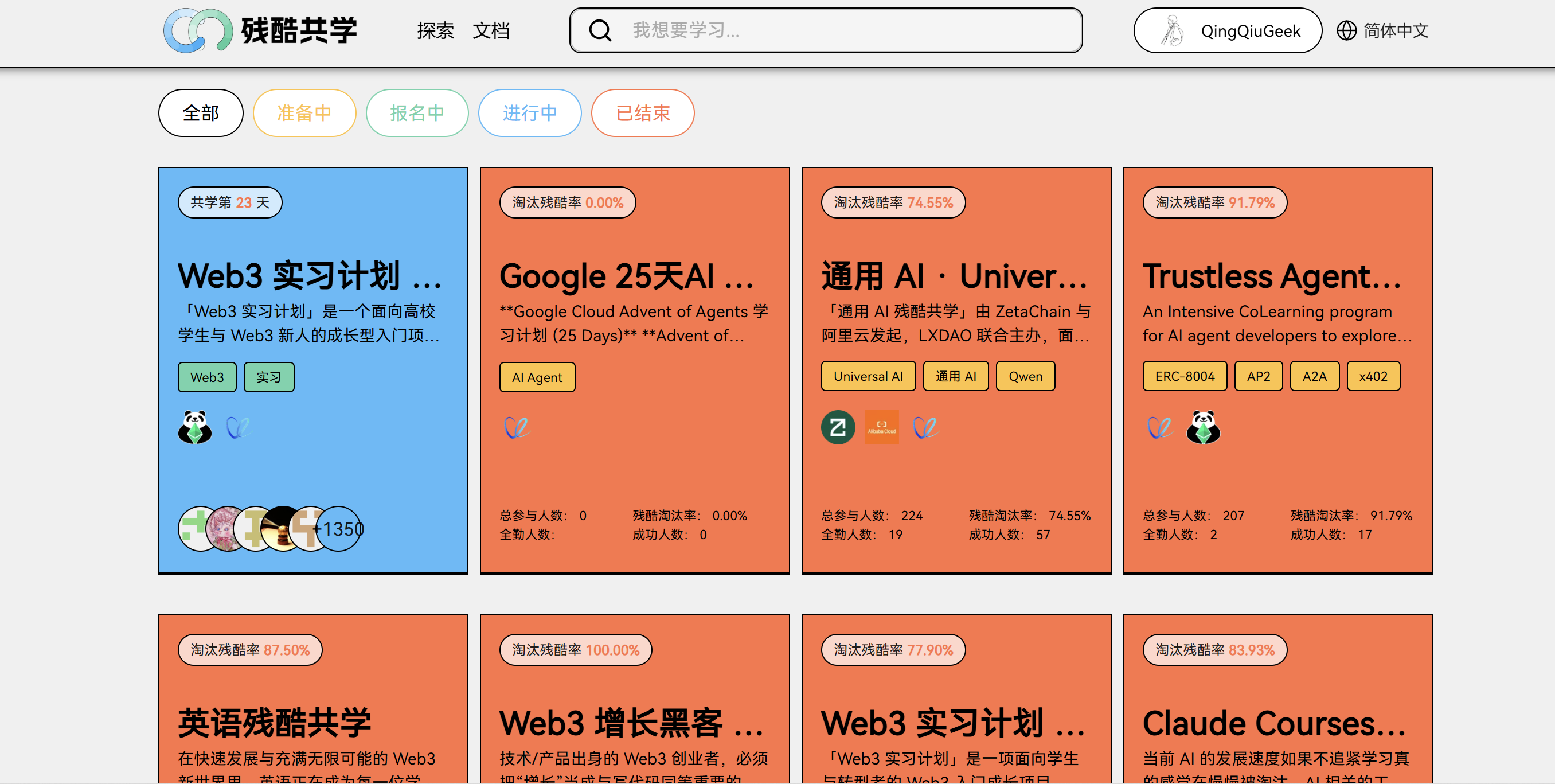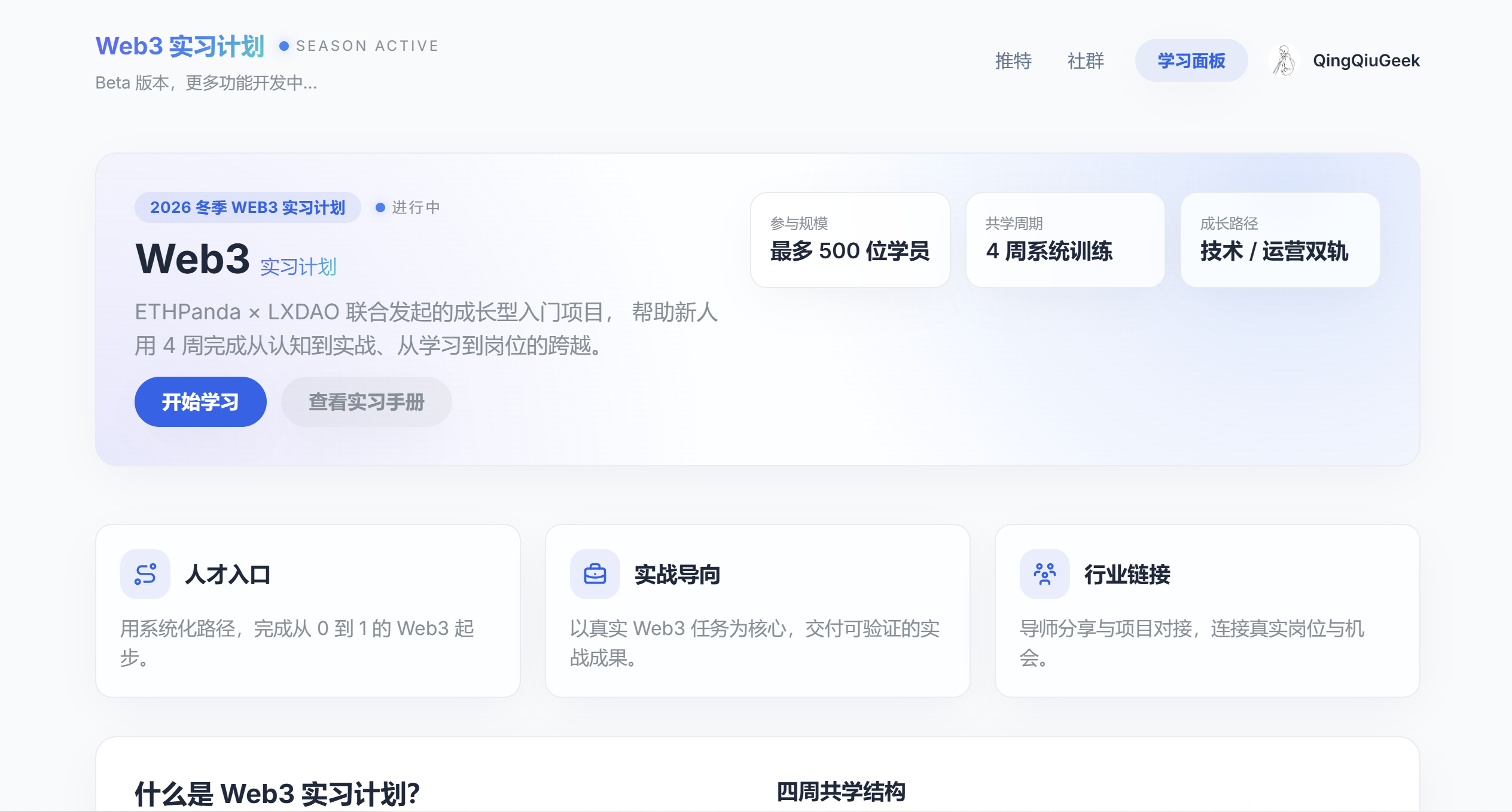 不定期有开源免费性质的课程,自主打卡制参与,有机会获得实习机会,很适合 web3 新人。