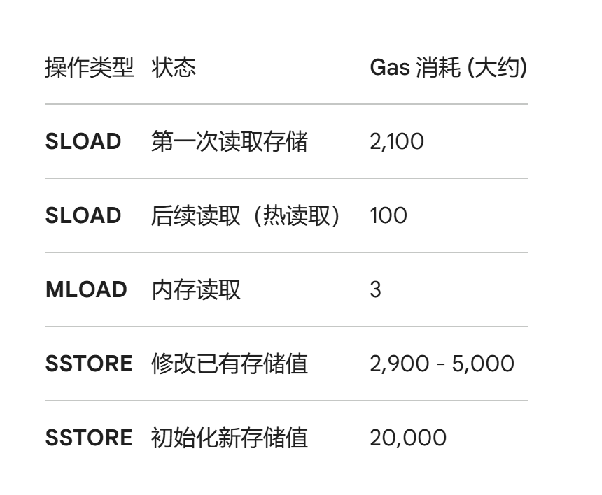 storage需 2100 gas(后续是热读取需 100 gas),而读取memory仅 3 gas。推荐多次访问同一存储数据时,将其缓存到memory以减少 SLOAD 次数。 -