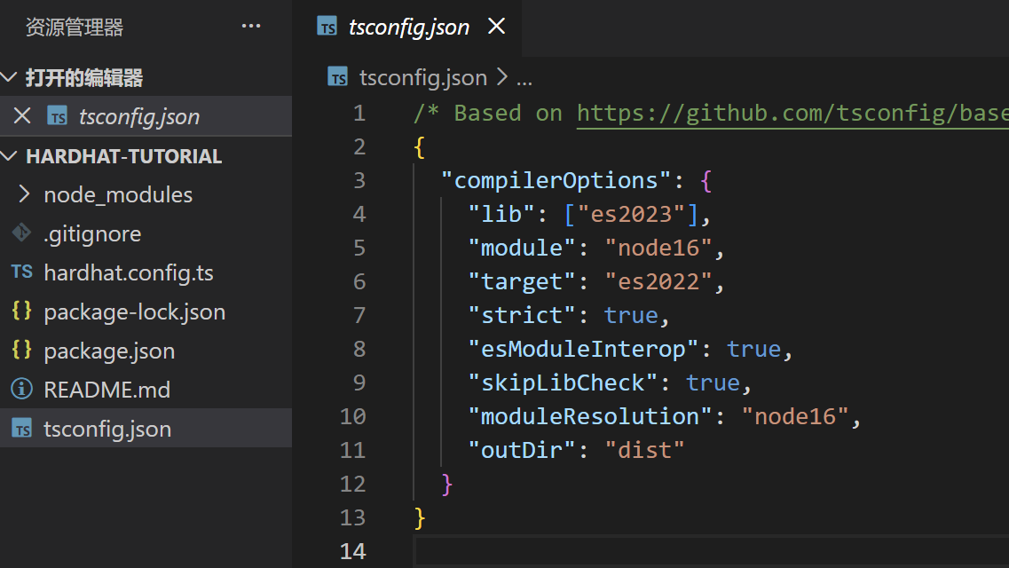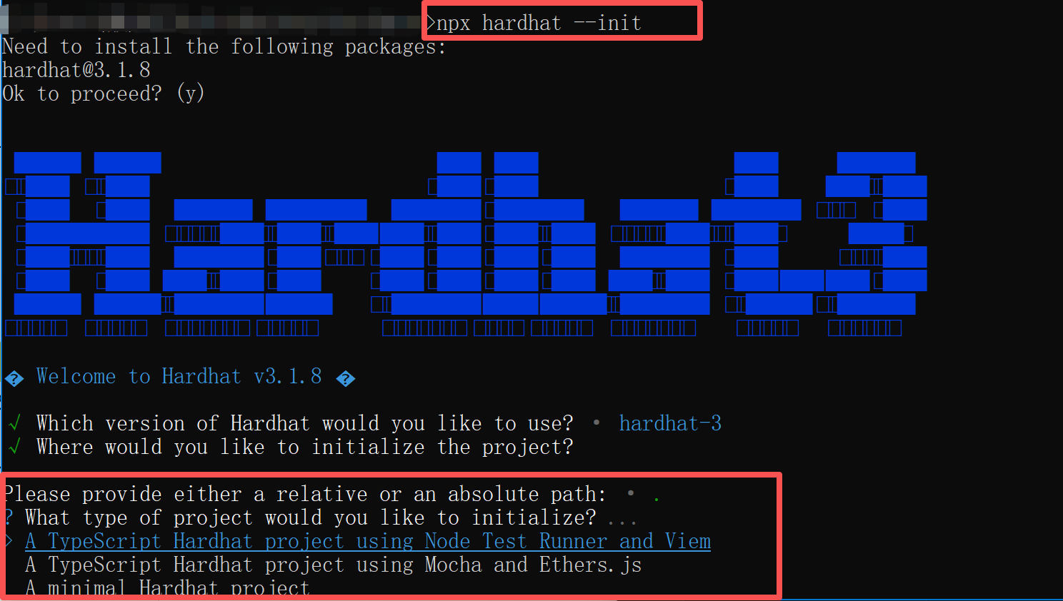 有三种初始化方式,先选择了minimal Hardhat project,minimal只包含 Hardhat 核心功能,无测试框架:不预装 Mocha/Chai 或 Node Test Runner,无 Web3 库:不包含 Ethers.js、Viem 等