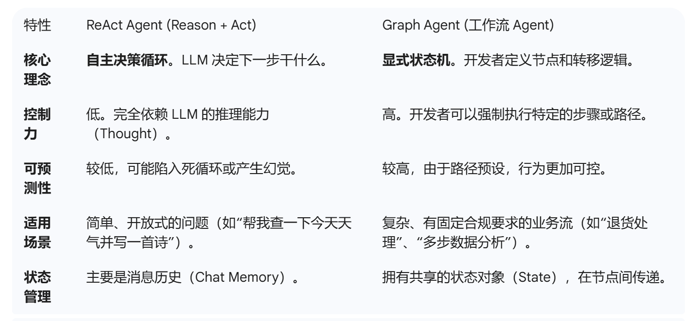 ReAct和Graph区别本质上是在选择**“AI 说了算”还是“规则说了算”**。