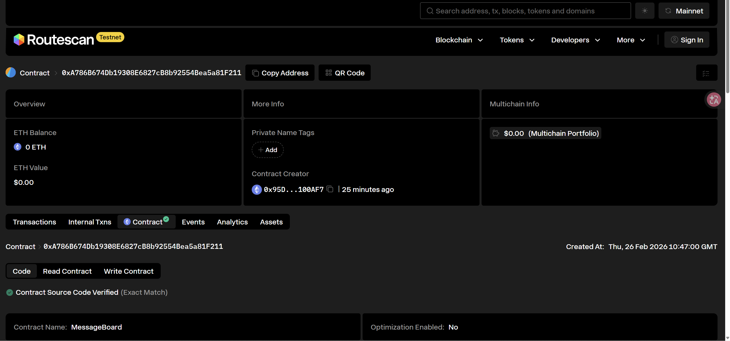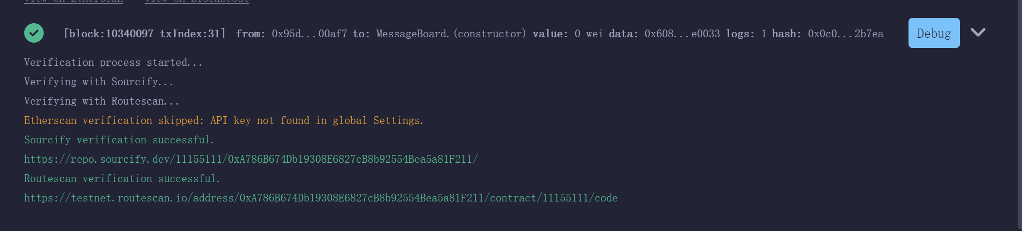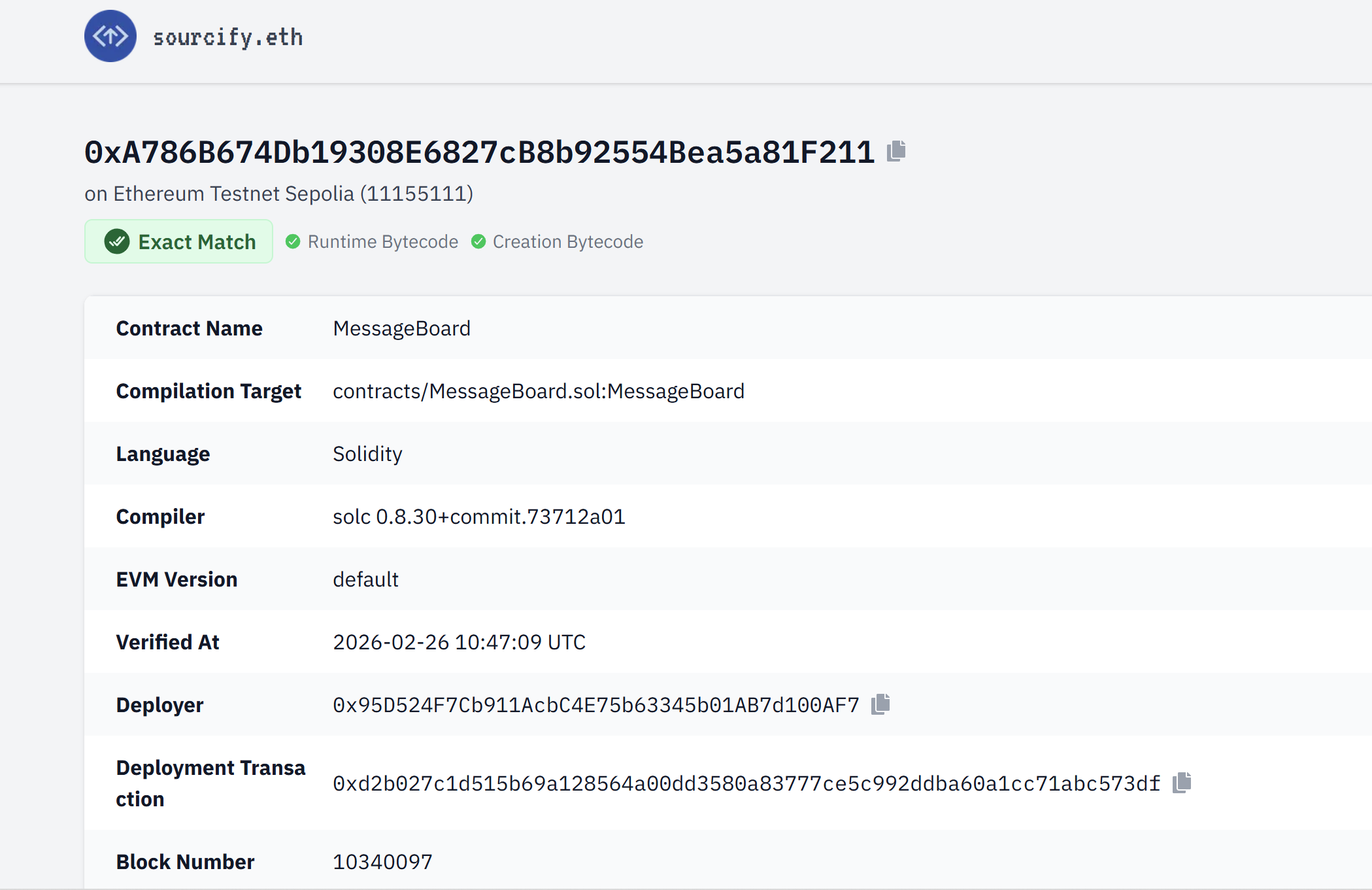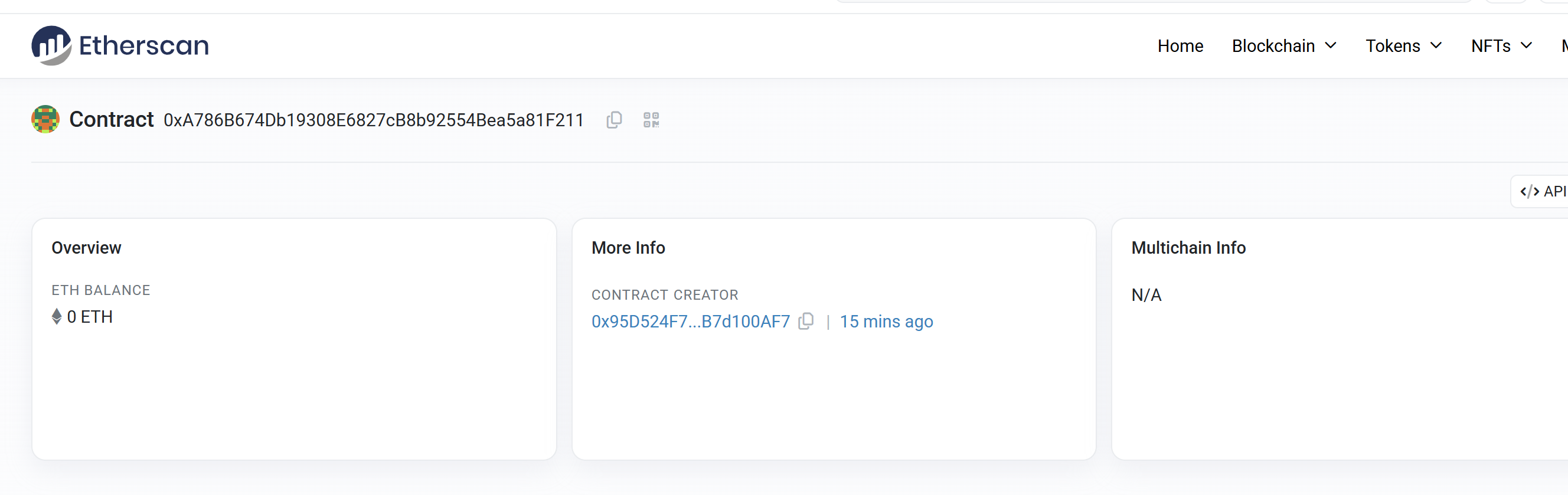 routescan测试网也可以查询部署的合约 https://testnet.routescan.io/address/0xA786B674Db19308E6827cB8b92554Bea5a81F211/contract/11155111/code