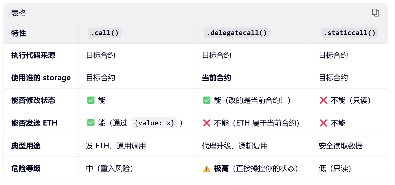 在 EVM(以太坊虚拟机)中,所有合约交互最终都通过以下操作码实现: