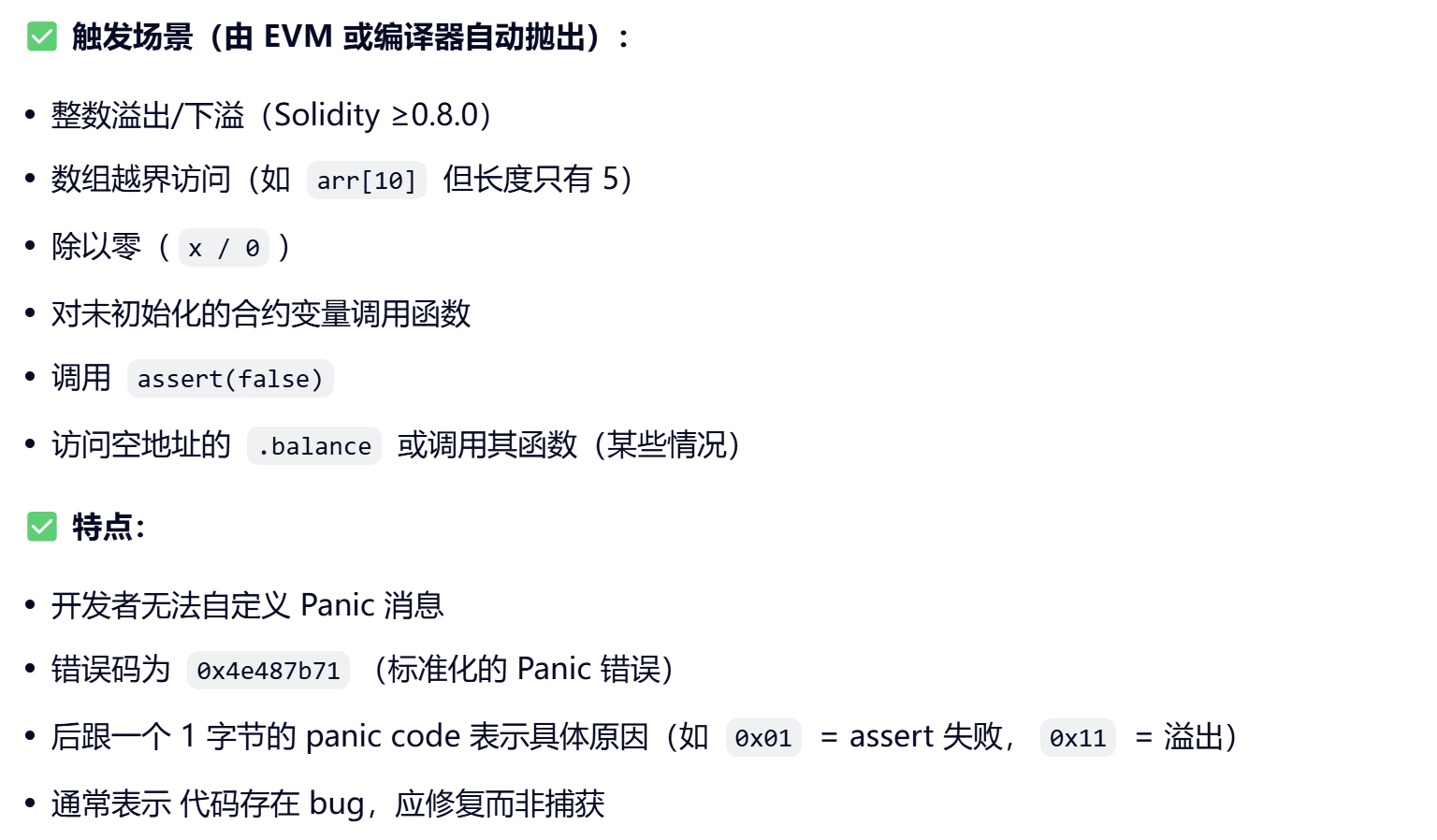 panic 表示“程序内部严重故障”,由 EVM 或编译器自动抛出,开发者无法自定义 Panic 消息