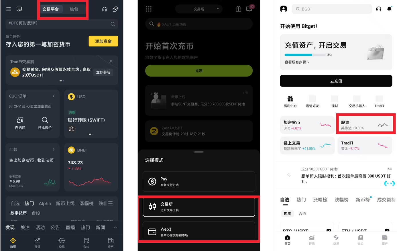 UEX 全称 Universal Exchange 全场景交易所,由 Bitget 首席执行官 Gracy Chen 提出,目前已经应用在 bitget。UEX 将 CEX、DEX 融合,用户可以从单一账户中交易多种资产,包括加密货币、股票、ETF、外汇、黄金和现实世界资产 (RWAs),如房地产、商品和知识产权。如下图分别是币安、okx、bitget 的应用首页,可以发现 bitget 已经可以进行股票交易了,而币安、okx 还不行!
