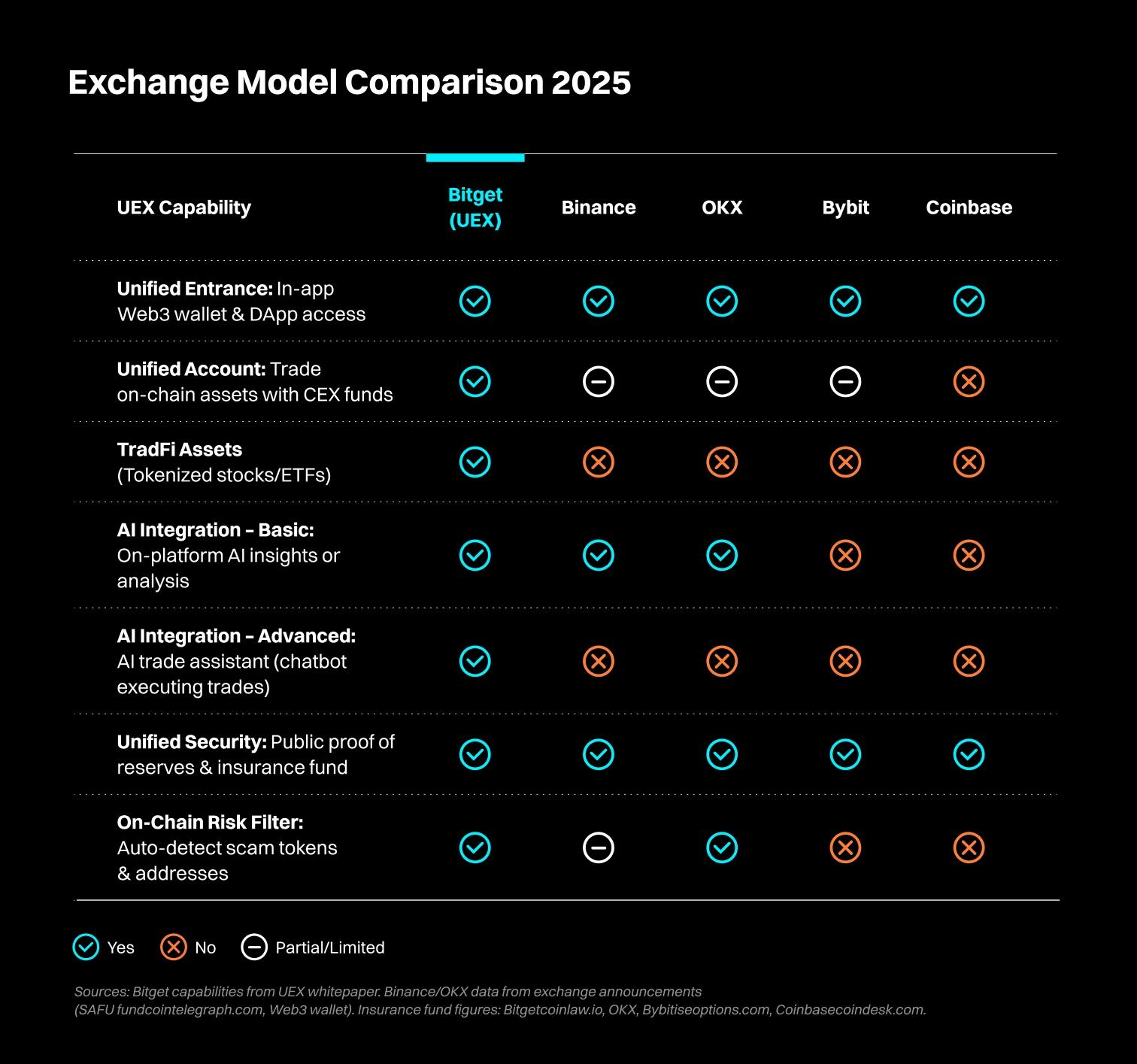 在 2025 年第三季度,Bitget 链上交易开始支持 ETH、BSC、Base 和 SOL 上的所有链上资产,成为首个支持用户使用 CEX 资金自由交易全量区块链资产的平台。这实际上标志着 CEX 首次实现对资产“无许可”,达到 DEX 级别的覆盖广度。OKX 随后也宣布在其交易所 App 中直接支持交易所有链上资产。