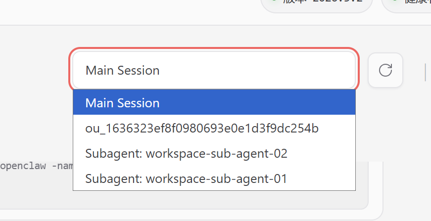 openclaw tui的会话是main会话,链接飞书的会话是ou_…,另外两个是飞书会话通过sessions_spawn创建的两个子代理用于执行任务