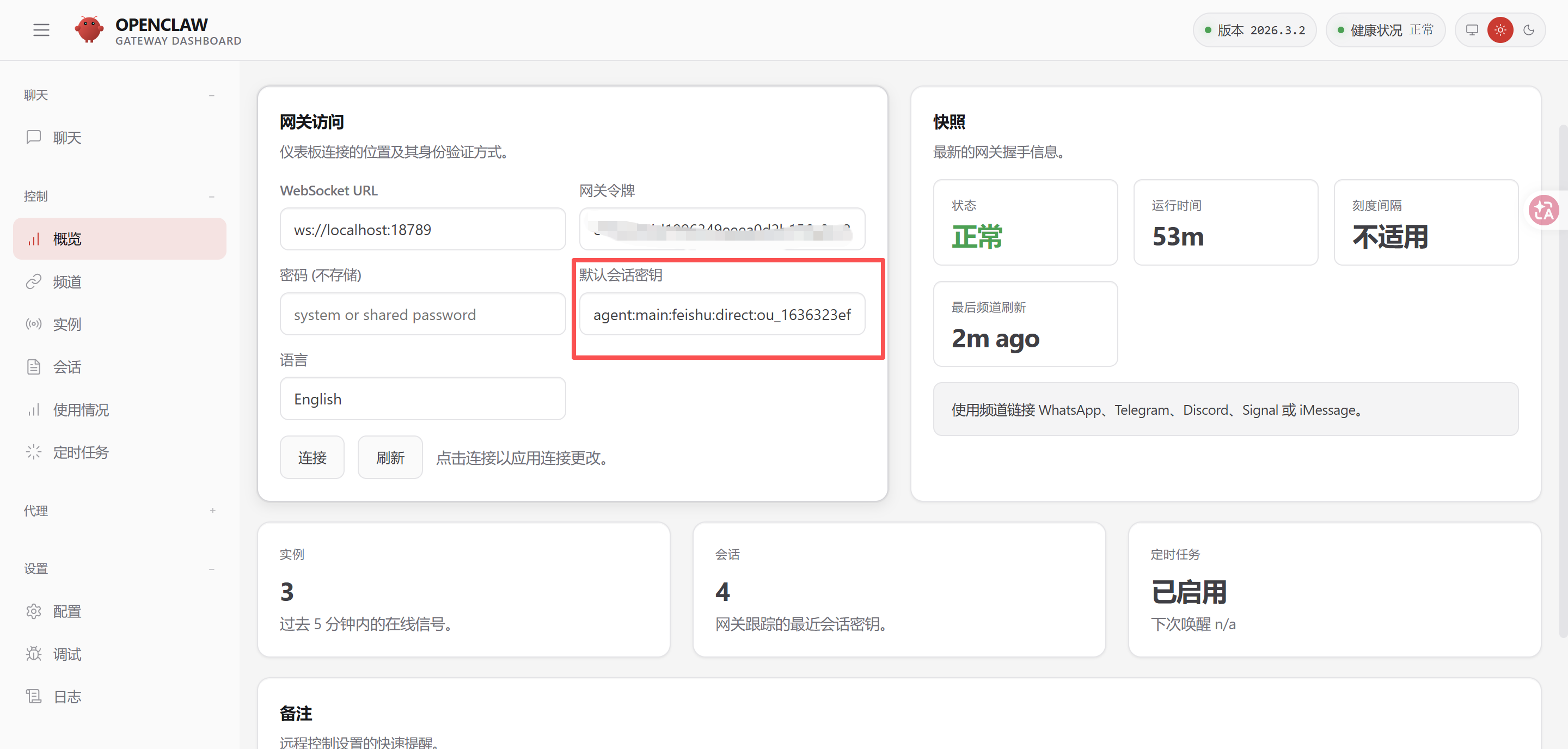 下面这个密钥表示:主 Agent (main会话)通过飞书,与 ID 为 ou_1636… 的会话进行私聊。