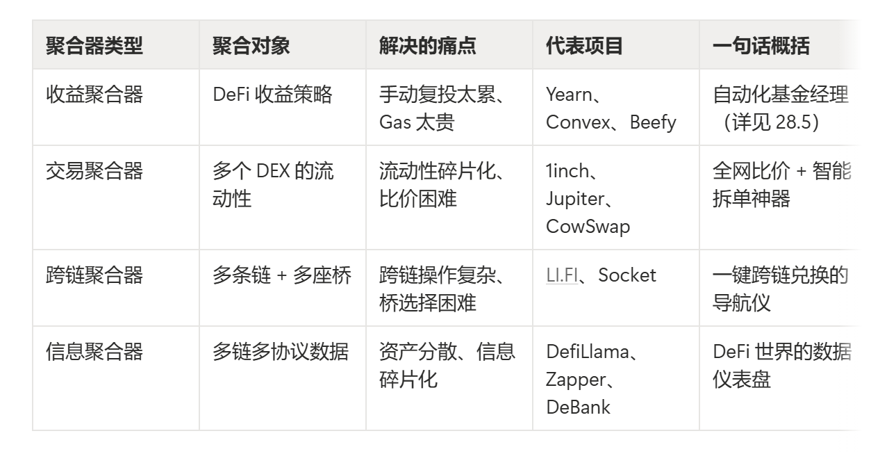 聚合器分为收益聚合器(Yield Aggregator)、交易聚合器(DEX Aggregator)、跨链聚合器(Bridge Aggregator)、以及信息聚合器(Info Aggregator)DefiLlama