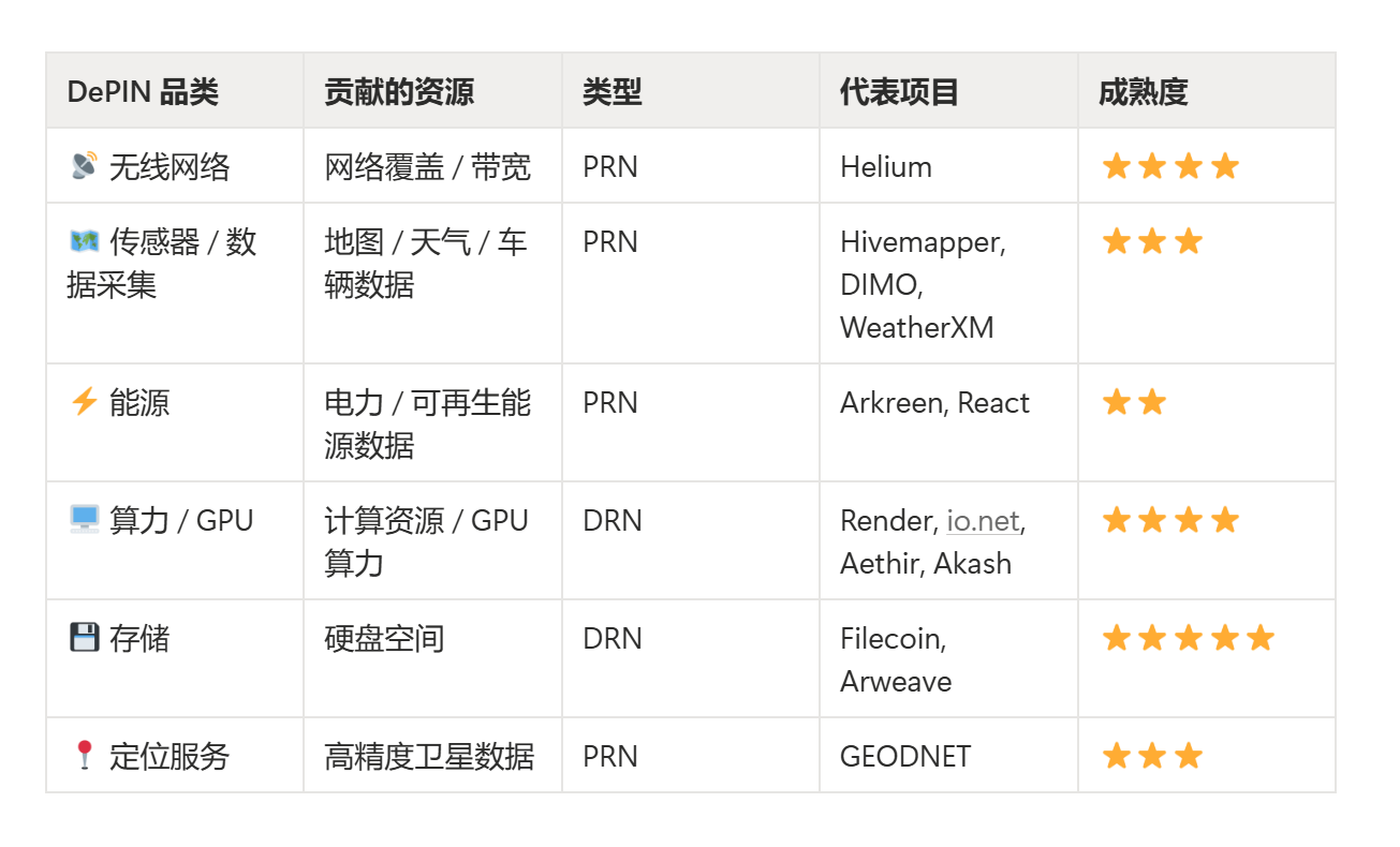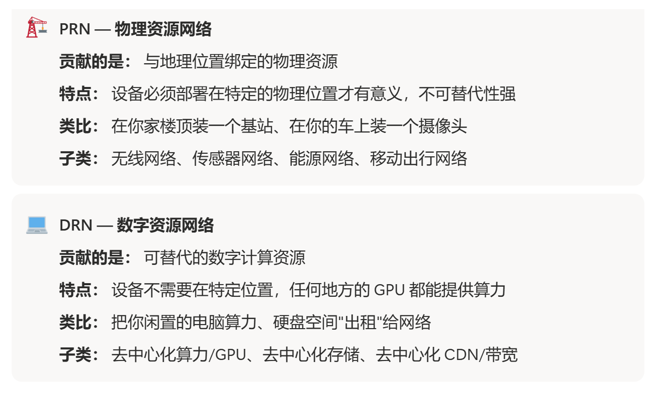 DePIN 分为两大阵营,PRN(Physical Resource Networks,物理资源网络) 和 DRN(Digital Resource Networks,数字资源网络)